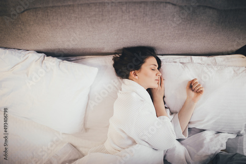 bed, female, bedchamber, beautiful, white, young, pillow, morning, sleep, relax, adult, home, lying, woman, person, rest, relaxation, caucasian, attractive, comfortable, 1, people, beauty, bedding, lifestyle, indoor, resting, bedtime, smile, alone, calm, room, happy, health, dream, face, portrait, lady, blanket, brunette, pretty, awake, cute, serene, cheerful, peaceful, happiness, sleepy, nap