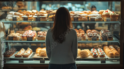 Young woman standing in front of a bakery display filled with various pastries and desserts, carefully choosing, with warm light creating a cozy atmosphere, concept of indulgence and choice