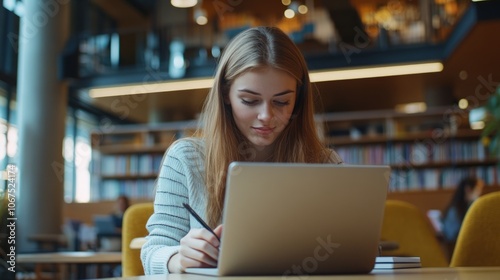 Young Woman Studying with a Laptop in a Modern Library