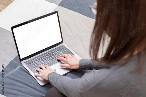 Young woman surfing on her metallic gray laptop and looking for informations on the internet. She has long brown hair, glasses and a gray sweater, and she sits on a plaid patterned sheet