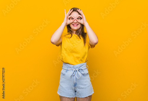 Young woman teenager wearing a yellow shirt showing okay sign over eyes