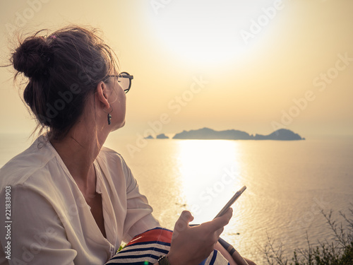 Young woman using smartphone at sunset in front of the sea on Ponza island coast