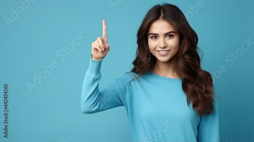 woman, pointing, hand, finger, confident, blue, casual attire, gesture, point, female, side, photogenic, young, girl, happy, smile, cheerful, background, adult, portrait, standing, showing, beard, person, looking, isolated, brunette, camera, up, expression, studio, model, guy, people, shirt, finger, emotion, presenting, promotion, manager, gesticulate, businessman, 1, space, caucasian, advertisement, style