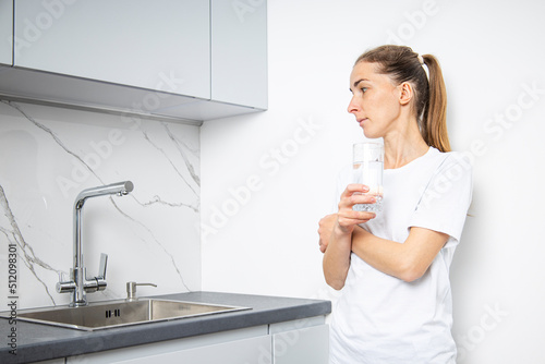 Young woman with a glass of water standing in the kitchen