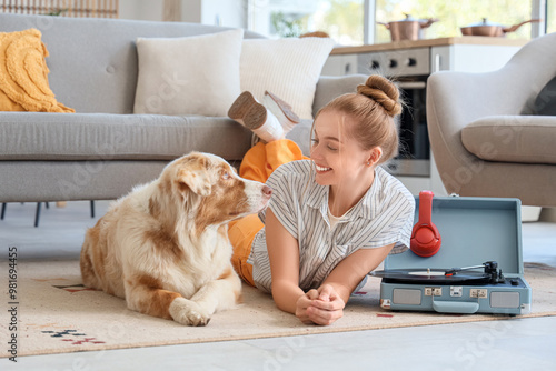 Young woman with Australian Shepherd dog and record player lying on floor at home