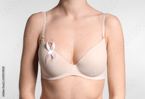 Young woman with beautiful breast and pink ribbon on light background. Cancer awareness concept