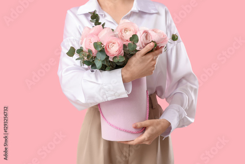 Young woman with bouquet of ranunculus flowers and eucalyptus on pink background