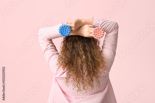 Young woman with hair scalp massagers on pink background, back view