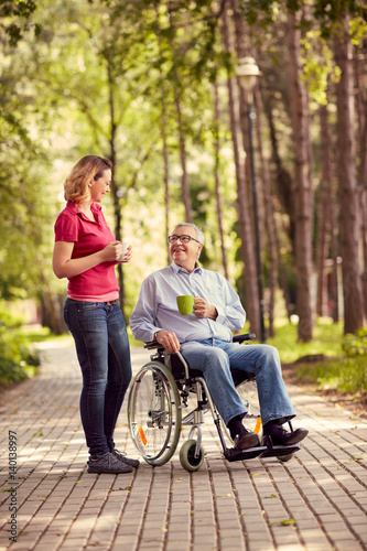 young woman with her disabled father in wheelchair enjoying time together outdoor.