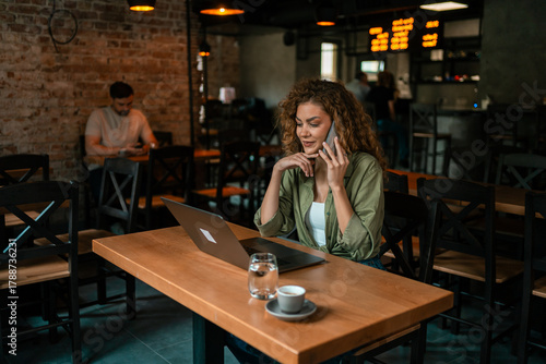 cafes, laptop, woman, work, hot drink, table, cosy, afternoon, casual attire, conversation, technology, tied-up, interior, relaxation, urban, environment, modern, people, social, cafes, digital, connection, leisure, lifestyle, productivity, curly hair, workspace, friendly, communication, brick wall, focused, student, entrepreneur, young adult, networking, seating, activity, menu, community, trendy, menu, silence, atmosphere, comfort, engagement