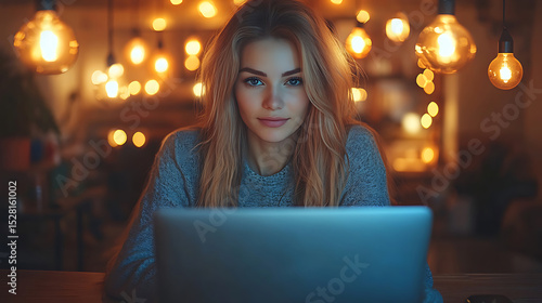 Young Woman Working on Laptop in Cozy Cafe with Warm Lighting