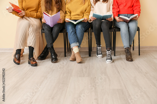 Young women with books sitting near color wall