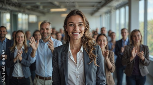 Your moment to stand out. Image of a successful businesswoman receiving applause from her colleagues in the office. At last