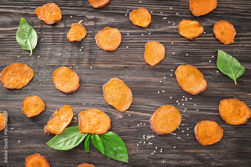 agriculture, background, chips, cook, cooking, crisp, cut, delicious, eating, food, fresh, fried, grilled, harvest, healthy, herb, ingredient, kitchen, natural, nutrient, object, organic, piece, potato, receipe, roasted, root, rustic, slice, sweet, table, thin, topview, vegetable, wooden, yam, deliciously