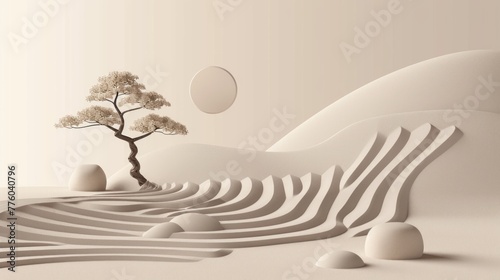 Zen Garden with Bodhi Tree Symbolizing Buddhist Principles