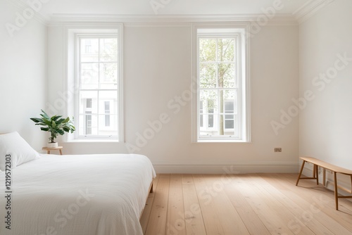 Zen interior design: Minimalist balance in open spaces. Bright, minimalistic bedroom with natural light and wooden flooring.