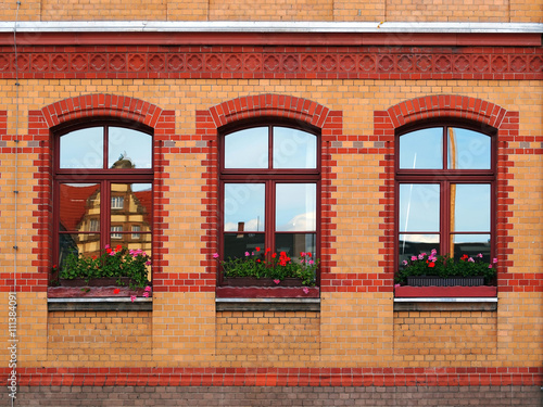 house, geranium, planter, apartment building, window, historic, frame, house, brick, masonry, window glass, brick, ornament, pane, adornment, wealth, building, flowerpot, pot, flower