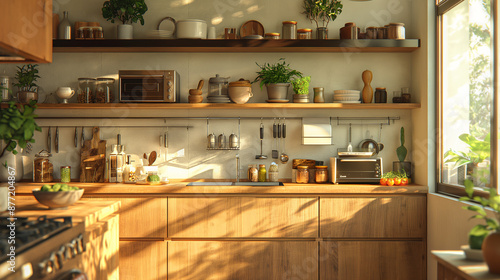 Zoom in, 2-sided counter of kitchen interior design wooden style, decorated with warm, soothing tones, classic tones and cooking equipment.