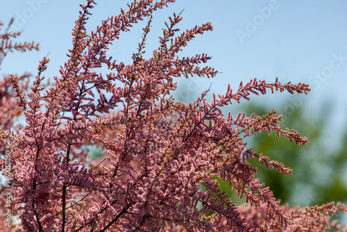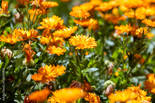 Orange flowers calendula in field. Tamarix bushes with pink branches in the meadow